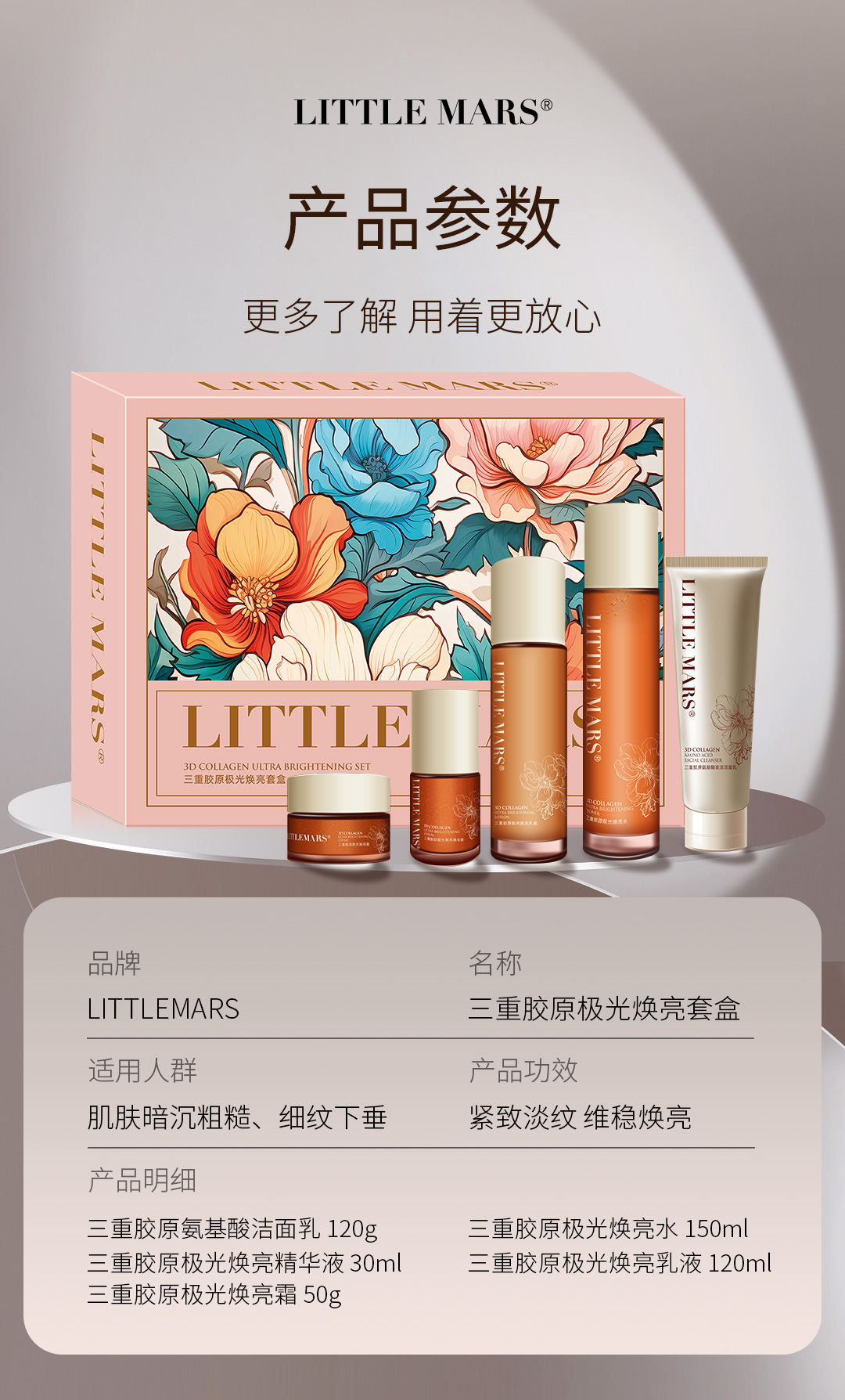 • 三重胶原极光焕亮套盒(洁面120g、水150ml、乳液120ml、精华液30ml、面霜50g)
